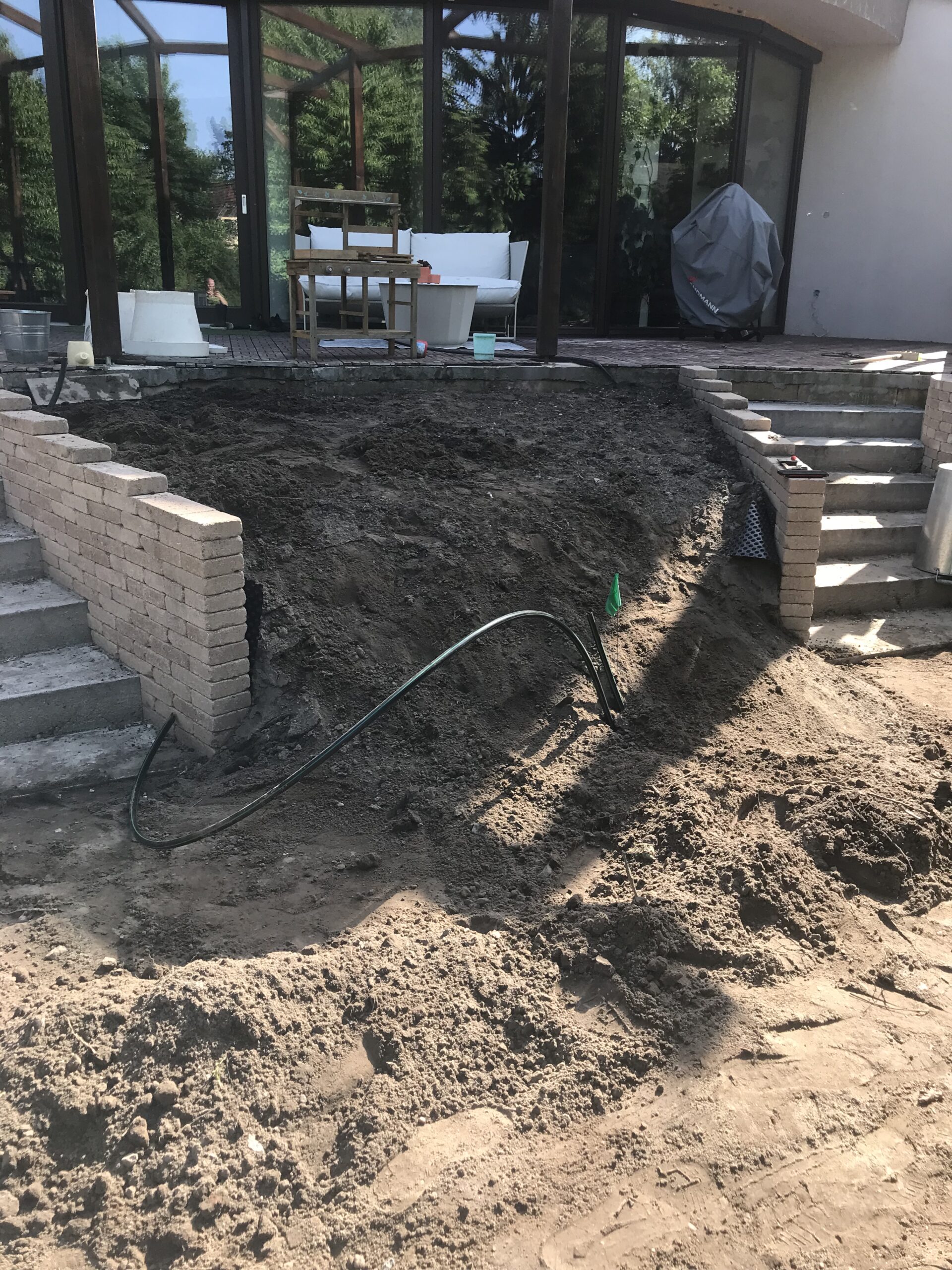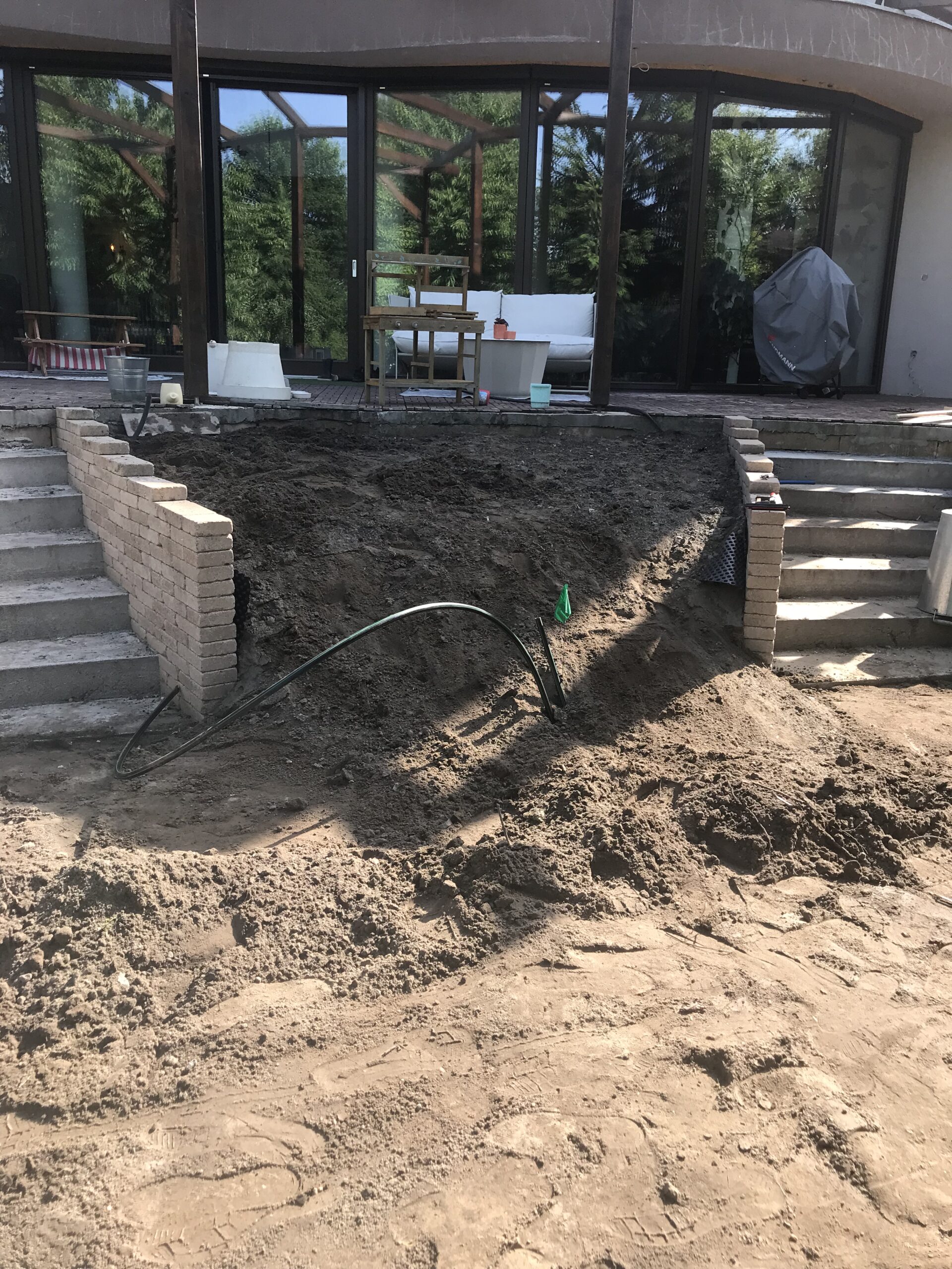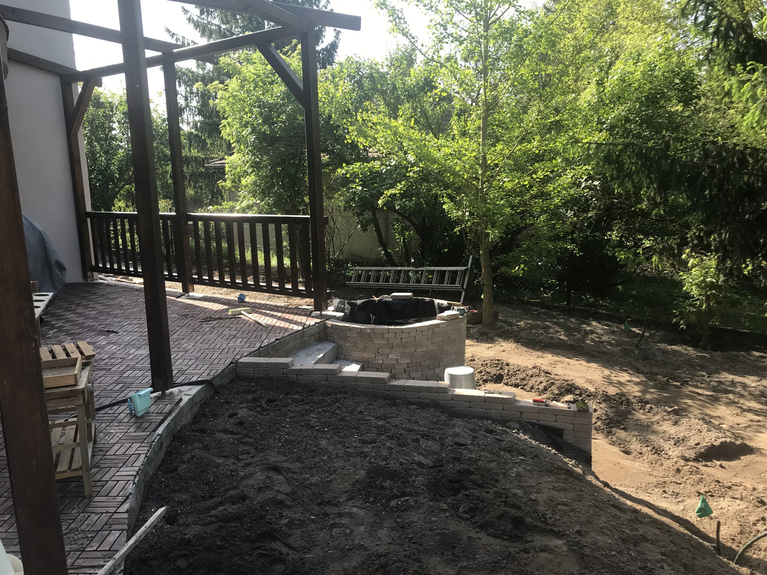 A kert egyik hangulatos pontja a sütögetős kiülő, amely már korábban is a telek része volt. Mi ezt a területet vettük körbe növényágyásokkal, rendezett zöldfelülettel és megfelelő szintezéssel, hogy még jobban illeszkedjen a kert egészéhez.