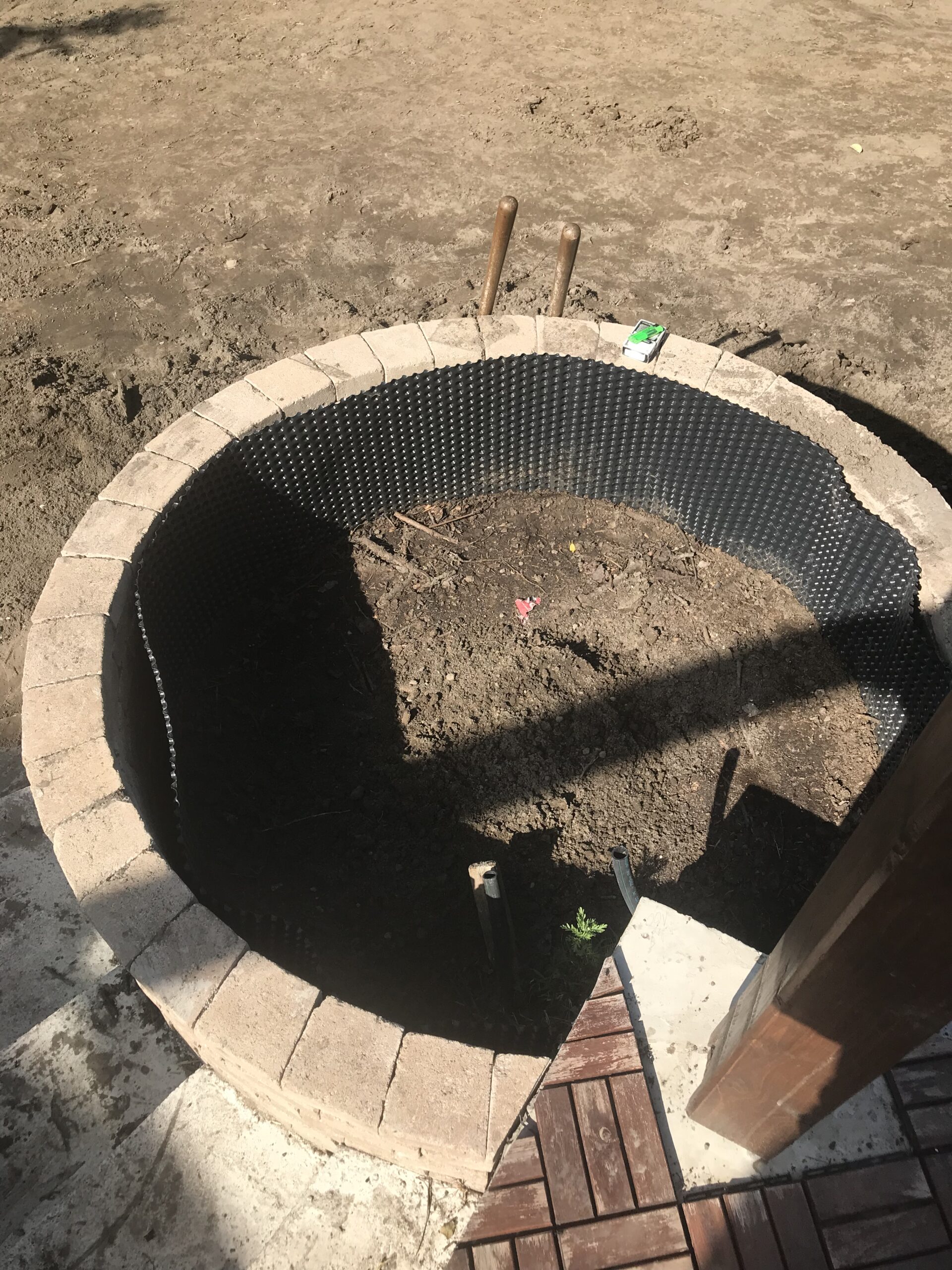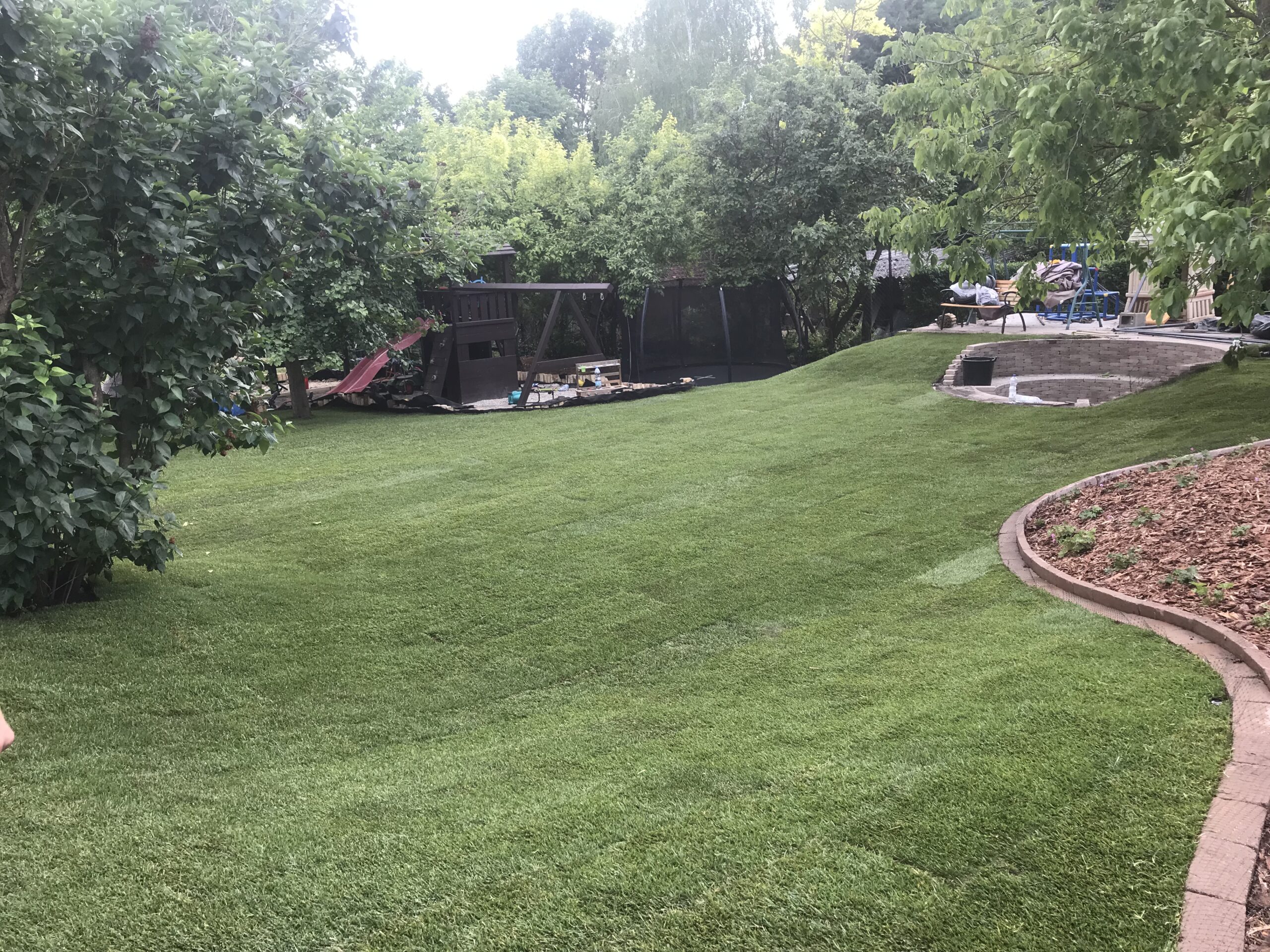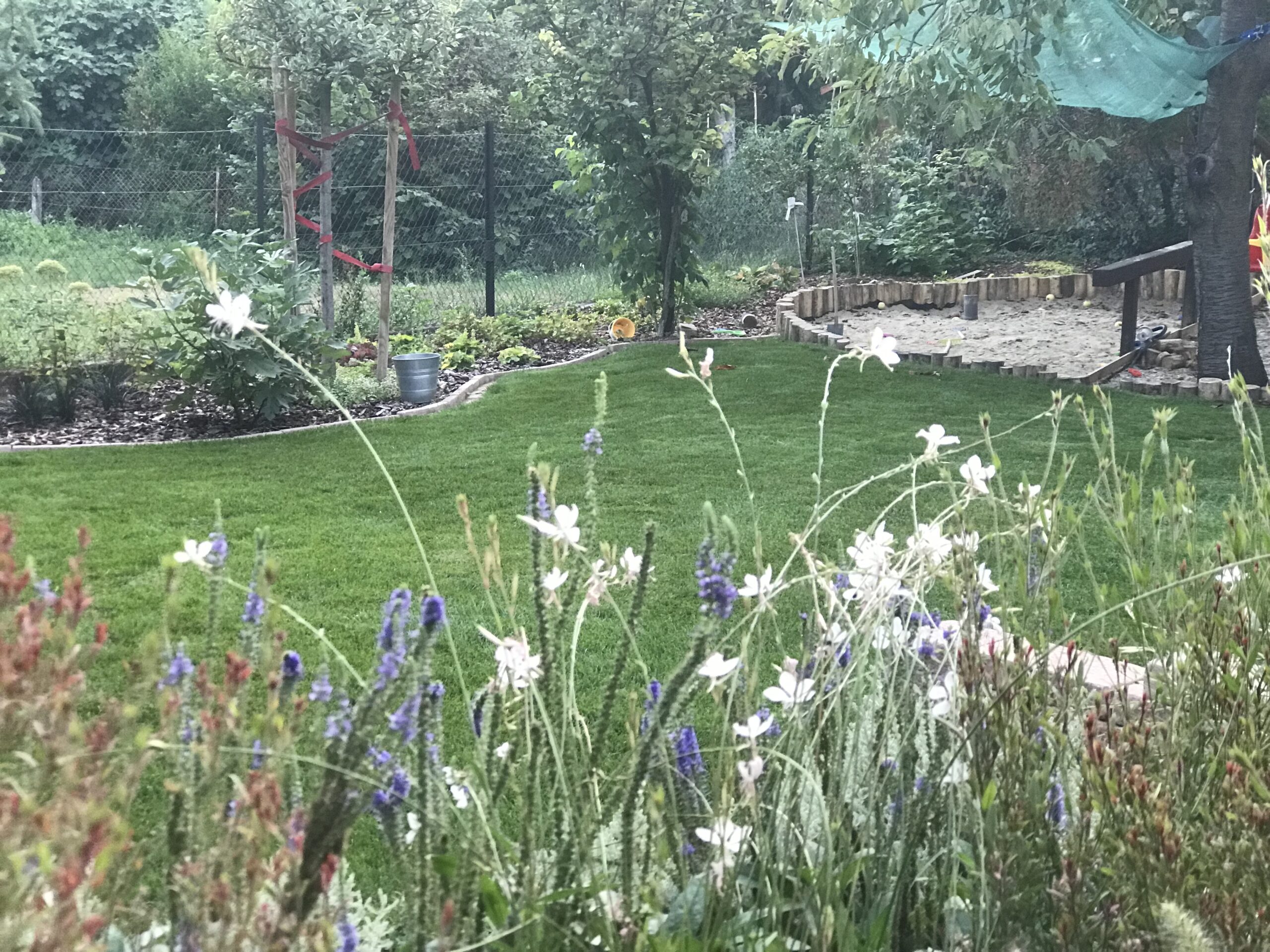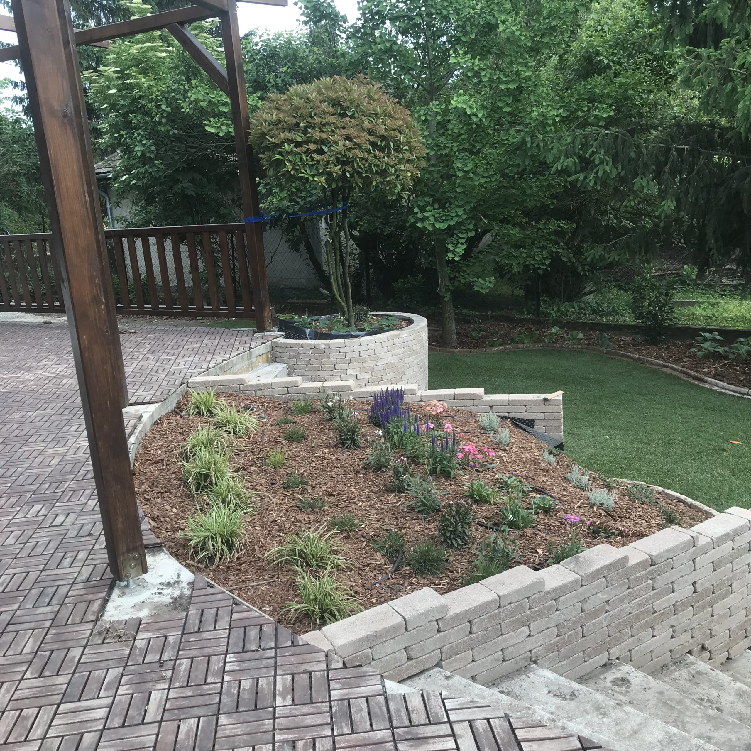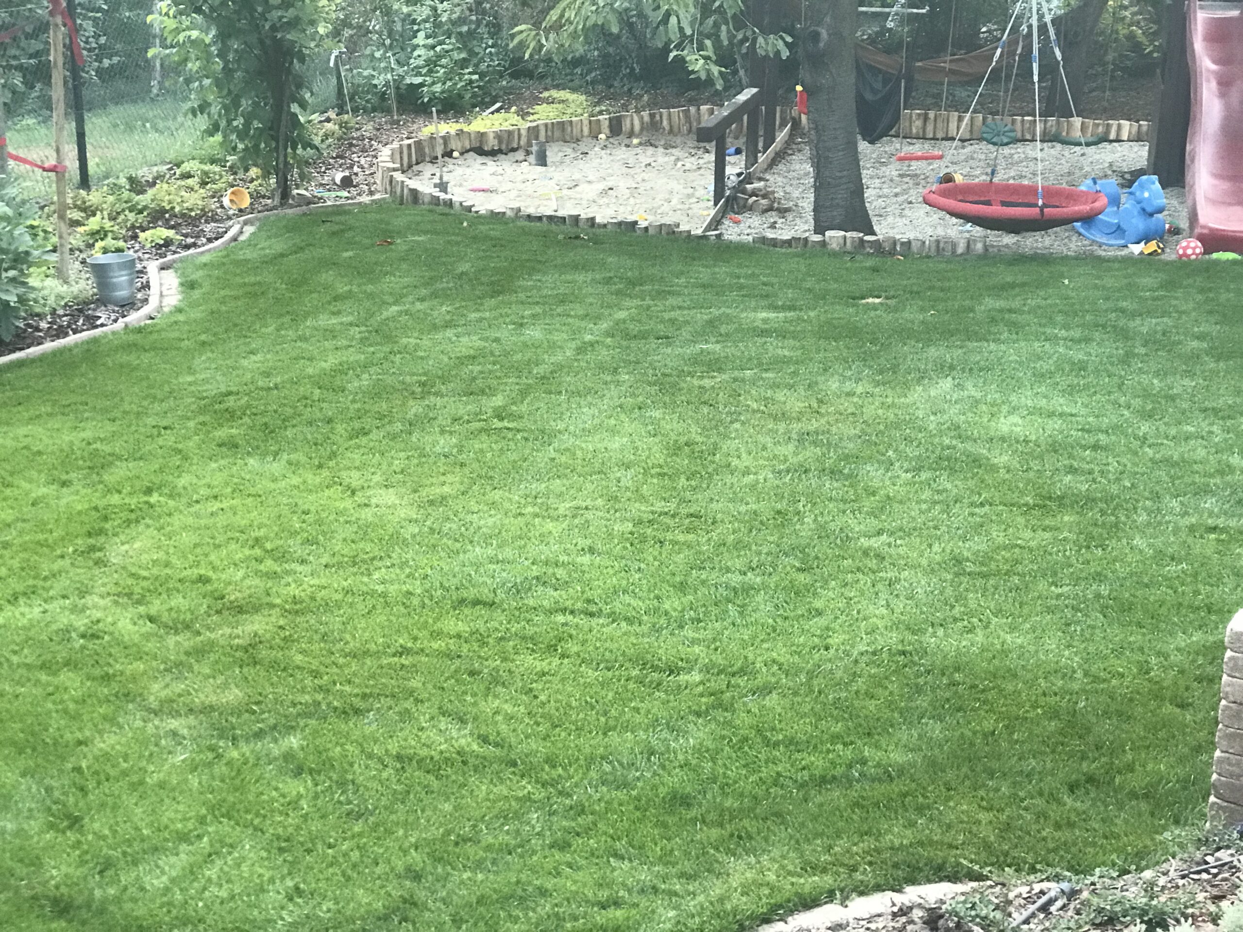 A kert gyepes területe gyepszőnyeg-terítéssel készült, így a munkálatok befejezése után azonnal puha, üde zöld felület fogadta a családot – ideális játszótér mezítlábas rohangáláshoz. A homokozó köré fenyőkéreggel borított virágágyás került, amely nemcsak esztétikus, de természetes módon segíti a gyommentességet és a talaj nedvességtartásának megőrzését is.