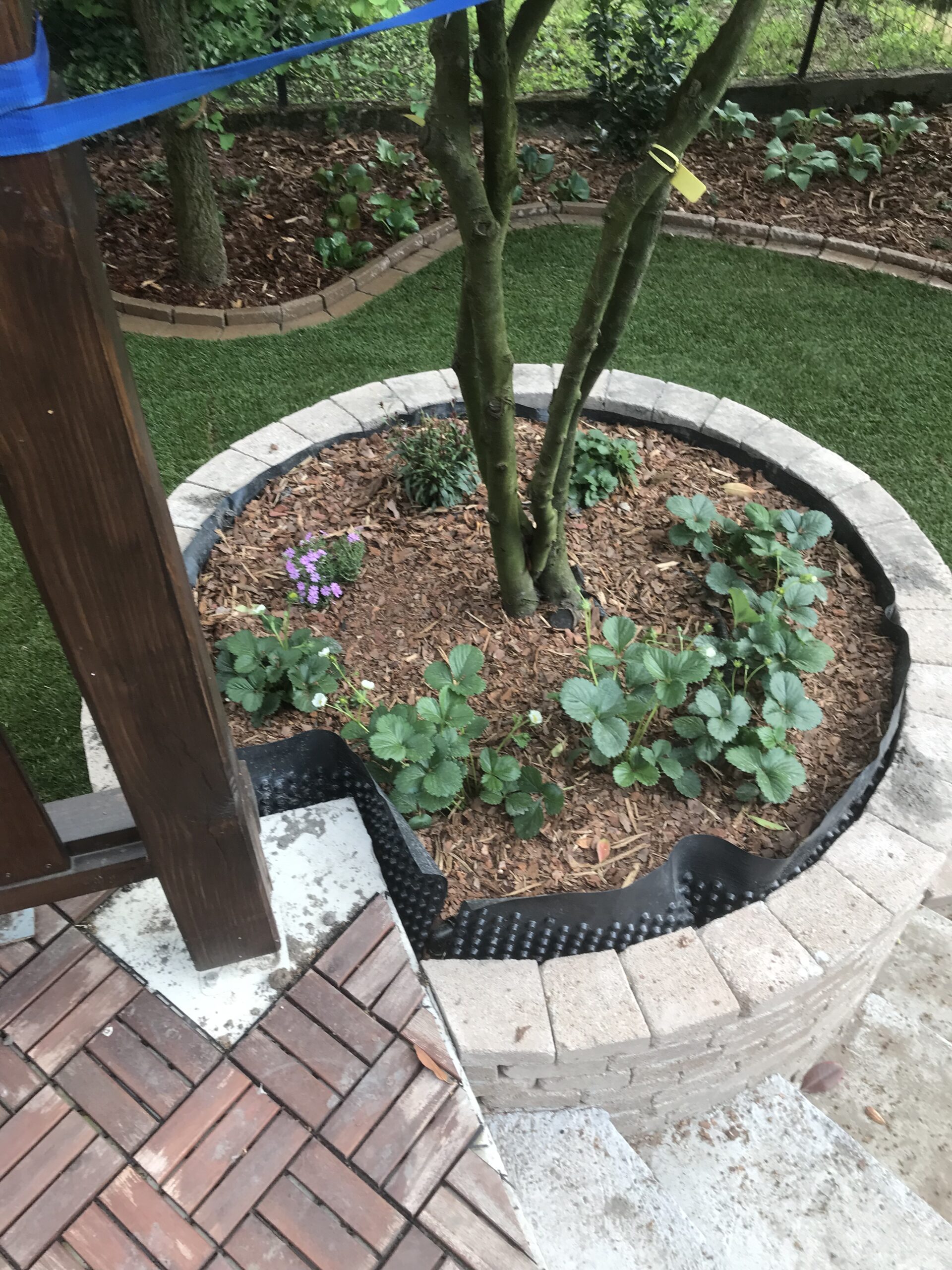 A kert egyik sarka a gyerekek kedvence lett: saját kis játszóterük mellett eper- és málnabokrok kaptak helyet, amelyeket úgy ültettünk el, hogy játék közben is könnyen elérhessék – így a természet valóban interaktív élménnyé válik számukra.
